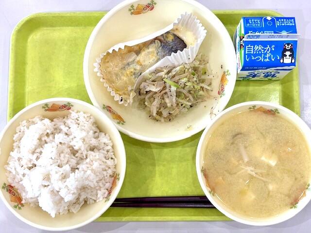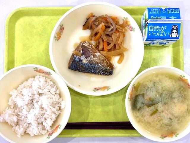 麦ごはん、牛乳、あおさのみそ汁、さばのしょうが煮、奈良和え