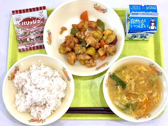 麦ごはん、牛乳、鶏肉とさつまいもの中華煮、卵スープ、一食いりこ