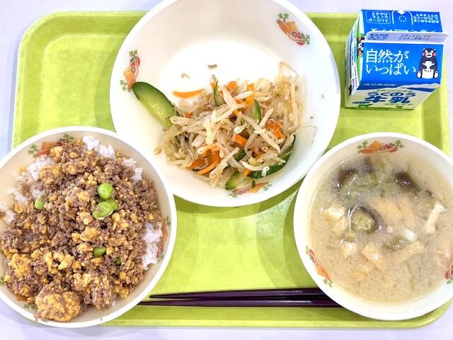 麦ごはん、牛乳、厚揚げのそぼろ煮、春雨の酢の物、ふりかけ