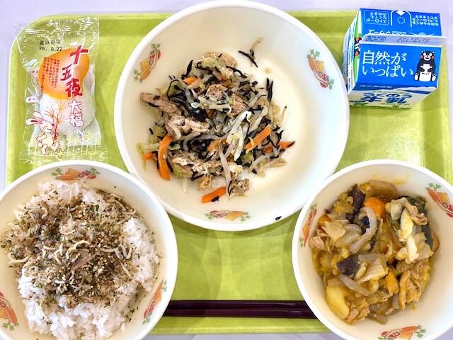 麦ごはん、牛乳、かぼちゃの甘煮、キャベツのひじき和え、手作りふりかけ、お月見団子
