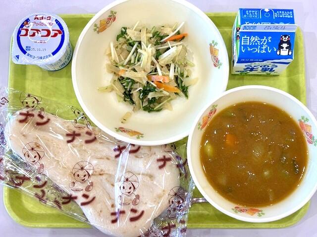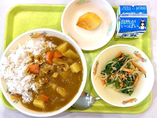 チキンカレー、牛乳、ほうれん草のごまあえ、柿