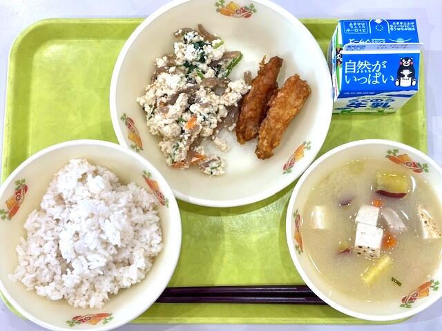 麦ごはん、牛乳、さつま汁、ピリ辛チキンバー、つぶつぶ白和え