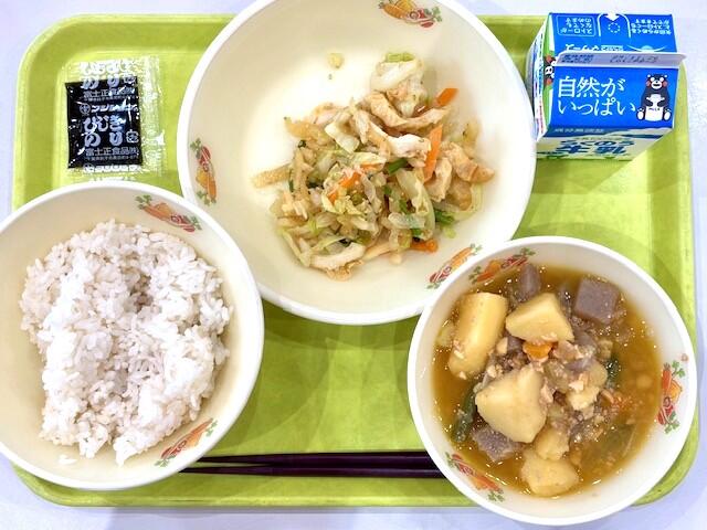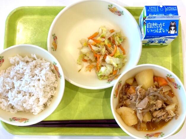 麦ごはん、牛乳、肉じゃが(ピリ辛みそ味)、白菜の甘酢和え