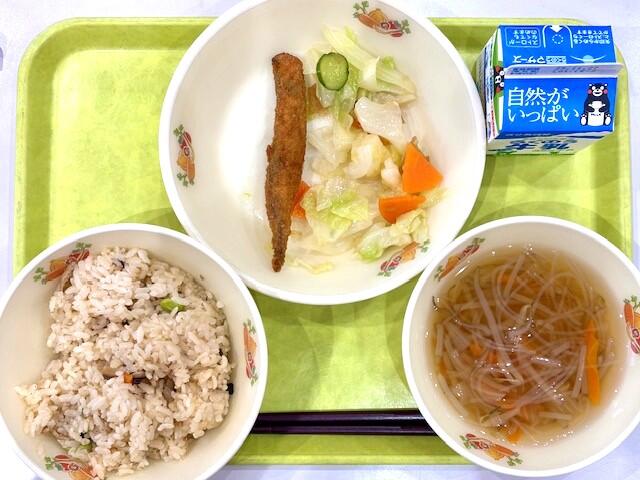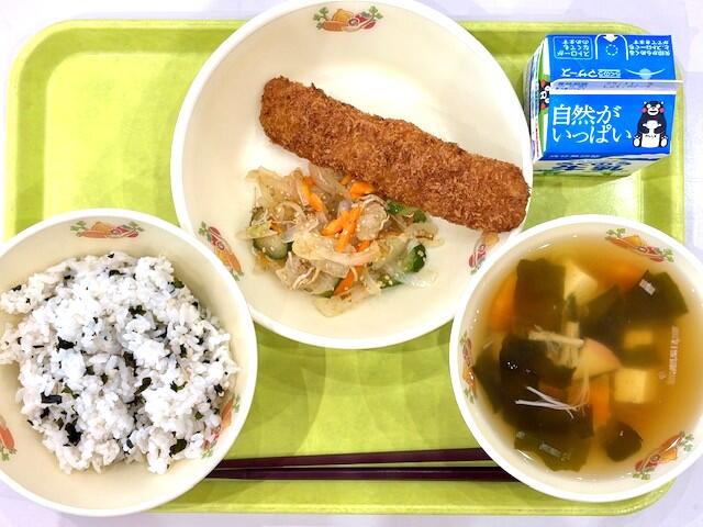 わかめごはん、牛乳、すまし汁、太刀魚のからあげ、玉ねぎのおかかあえ