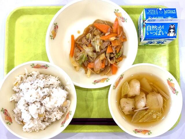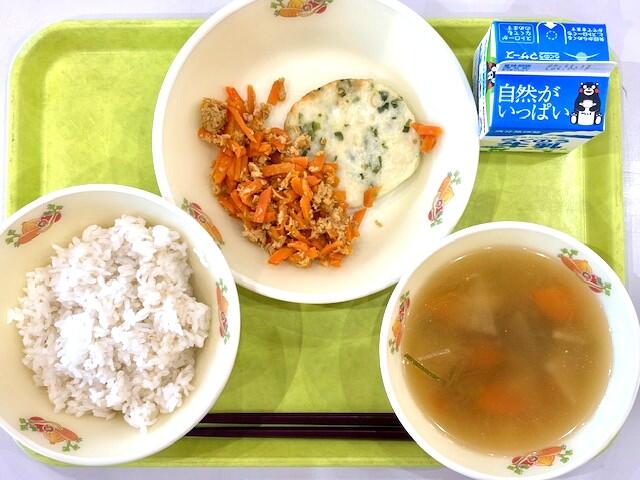 麦ごはん、牛乳、けんちん汁、人参しりしり、いかねぎ焼き