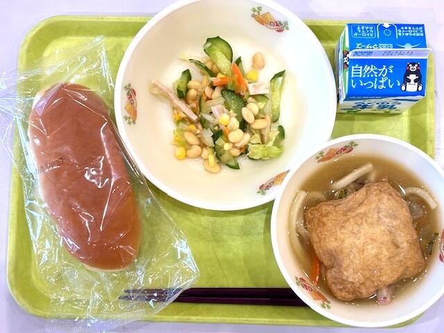 ミルクパン、牛乳、きつねうどん、大豆サラダ