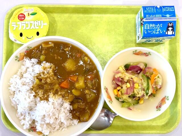 秋味カレー、牛乳、コスモスサラダ、ラ・フランスゼリー