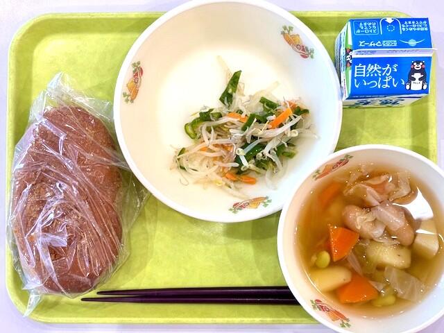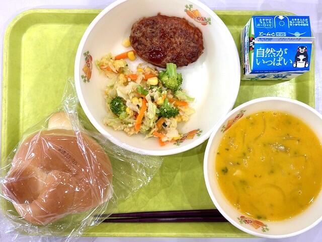 火の国パン、牛乳、ハンバーグ、ブロッコリーサラダ、かぼちゃクリームスープ