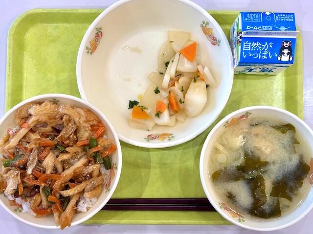 ごぼうのごまだれ丼、牛乳、さといものみそ汁、かぶのゆず果和え