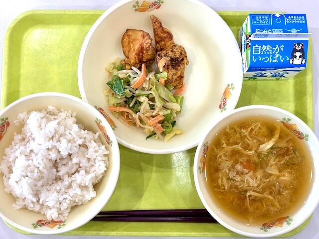 麦ごはん、牛乳、かきたま汁、とりのからあげ、小松菜のごまあえ