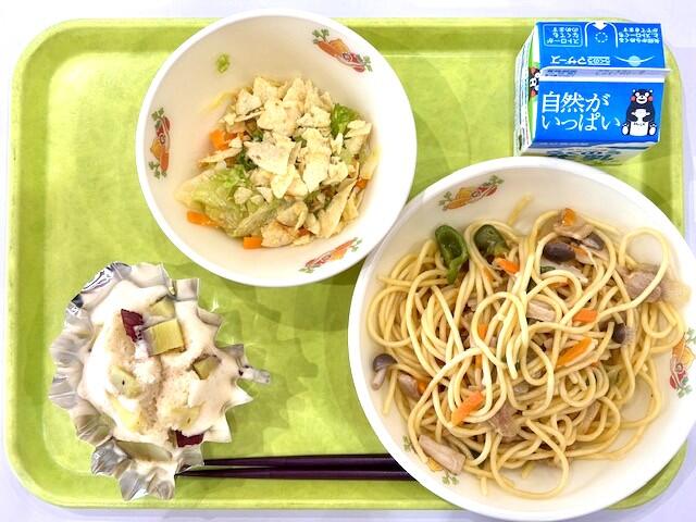 さつまいも蒸しパン、牛乳、きのことベーコンのスパゲティ、チップスサラダ、マーシャルビーンズ