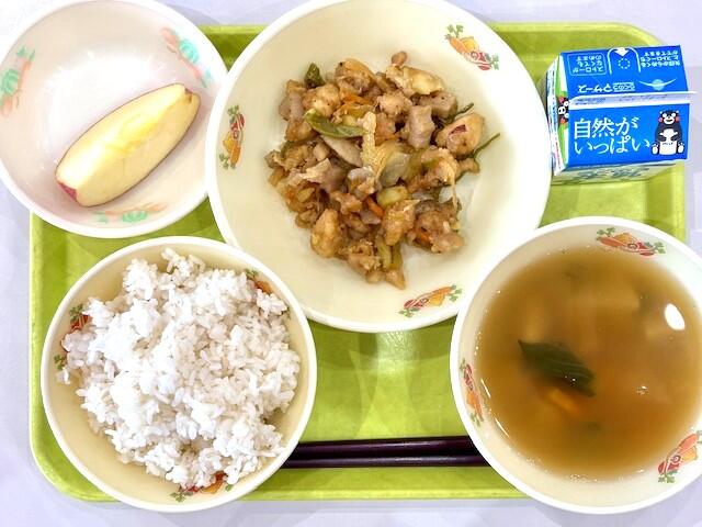 麦ごはん、牛乳、レンコンと鶏肉の南蛮づけ、白玉汁、りんご
