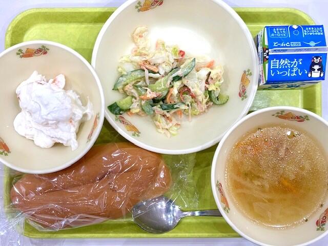 フルーツサンド、牛乳、コンソメスープ、かにかまときゅうりのごまネーズ
