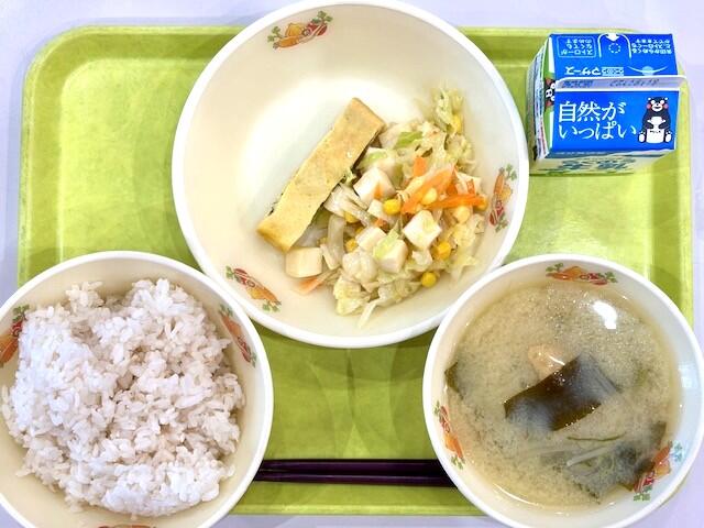 麦ごはん、牛乳、みそ汁、千草焼、豆腐サラダ