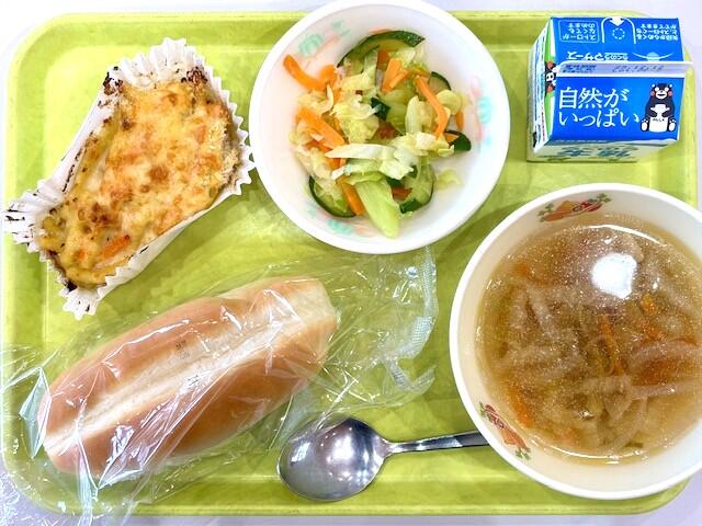 ソフトフランスパン、牛乳、白菜スープ、マカロニグラタン