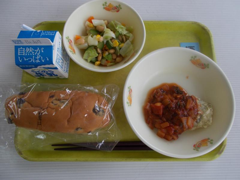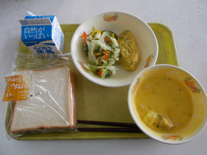 コッペパン、牛乳、魚のチリソース、豆乳のクリームスープ、梨