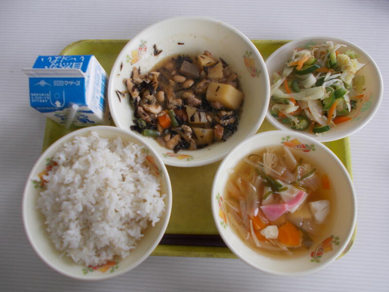 麦ごはん、牛乳、大豆の五目煮、切り干し大根の酢の物、ひじき佃煮