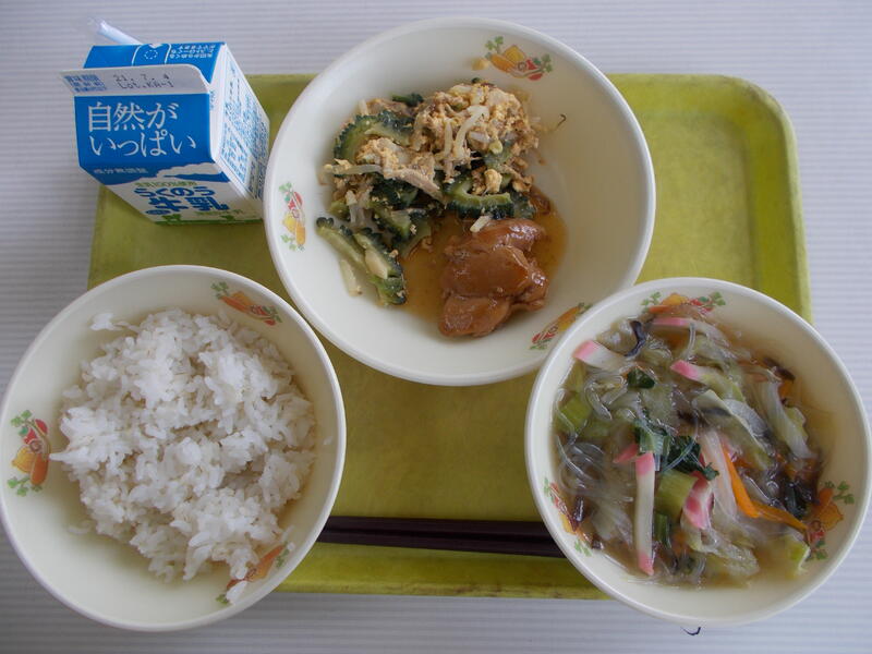 麦ごはん、牛乳、冬瓜のすまし汁、ゴーヤーチャンプル、肉みそ