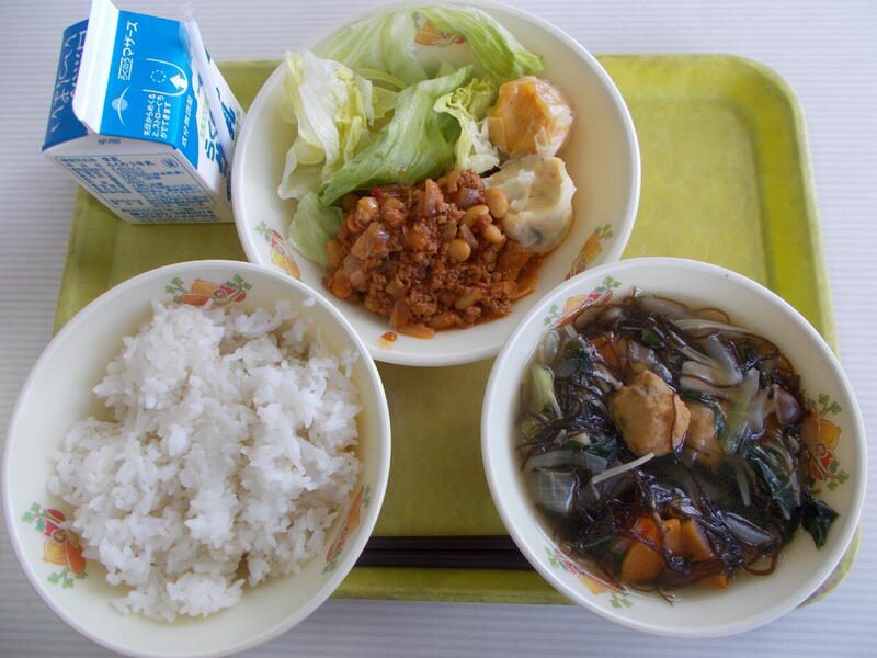 麦ごはん、牛乳、マーボー豆腐、なすの中華サラダ