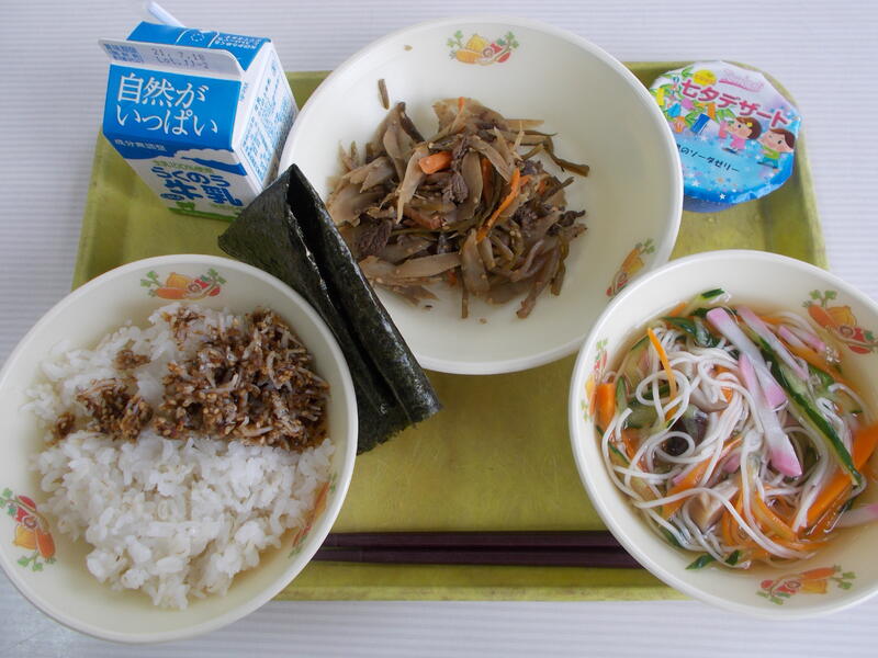 麦ごはん、牛乳、じゃがいものそぼろ煮、大根のからし和え、しそひじき