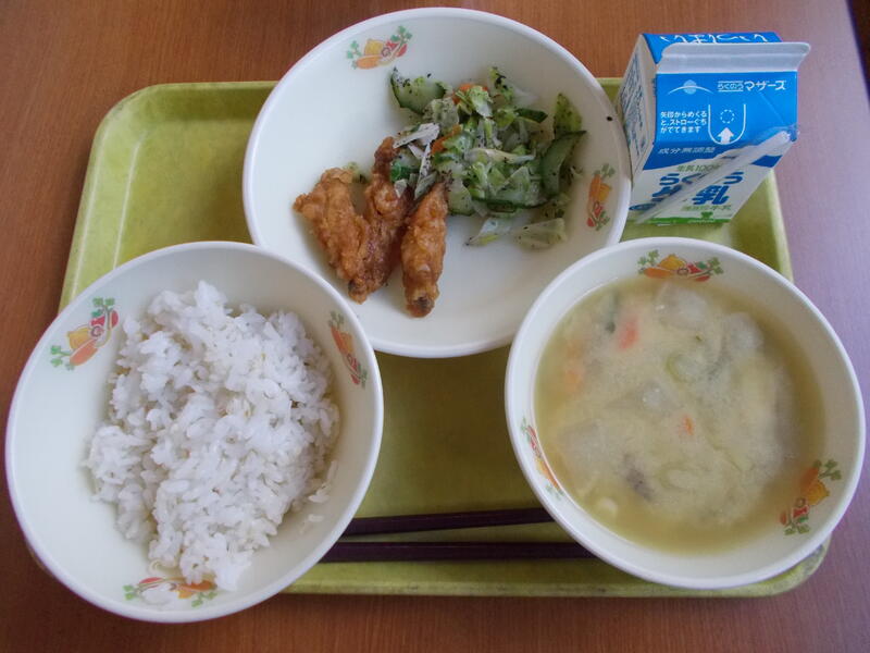麦ごはん、牛乳、エリンギと小松菜のみそ汁、鶏の唐揚げ、ごま和え