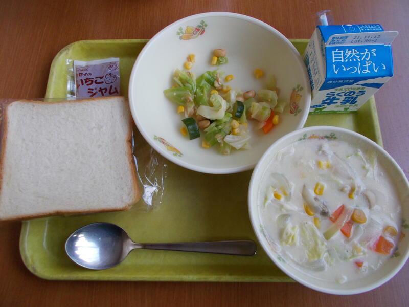 黄な粉トースト、牛乳、白菜のクリームシチュー、水菜とわかめのサラダ
