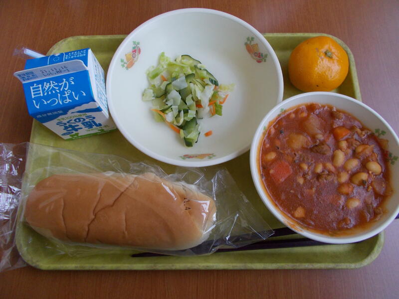 コッペパン、牛乳、チリコンカン、大根とベーコンのクリーム煮、柿