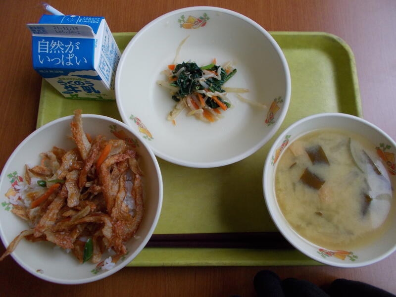 こぎつねごはん、牛乳、すまし汁、もやしのじゃこ和え、いわしのカリカリフライ
