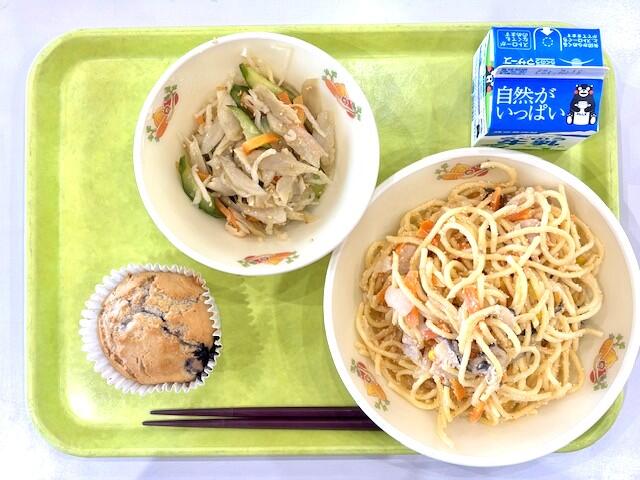 ブルーベリーマフィン、牛乳、たらこスパゲッティ、カミカミサラダ