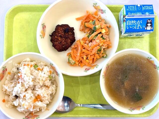 ピラフ、牛乳、オニオンスープ、照り焼きチキン、キャロットサラダ