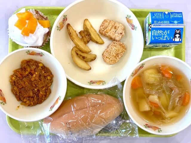 ココアパン、牛乳、親子うどん、キャンディーポテト