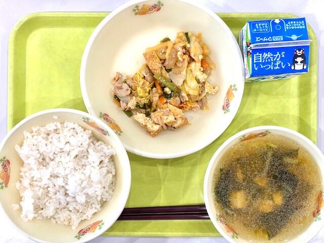 ひじきごはん、牛乳、卵スープ、豚肉のみそ炒め