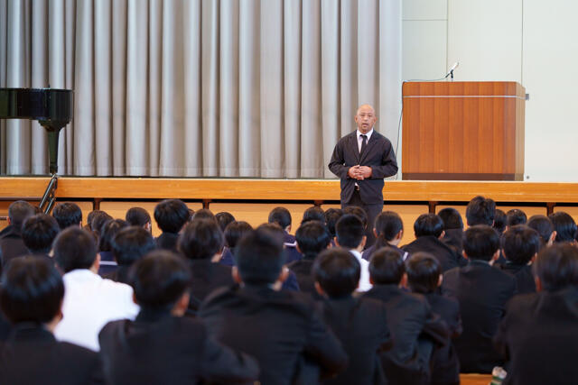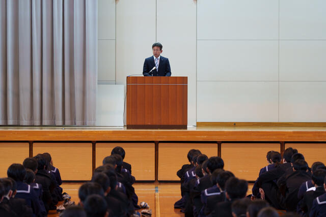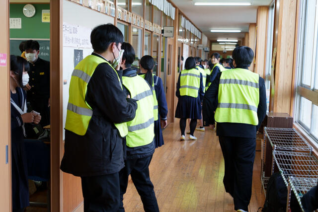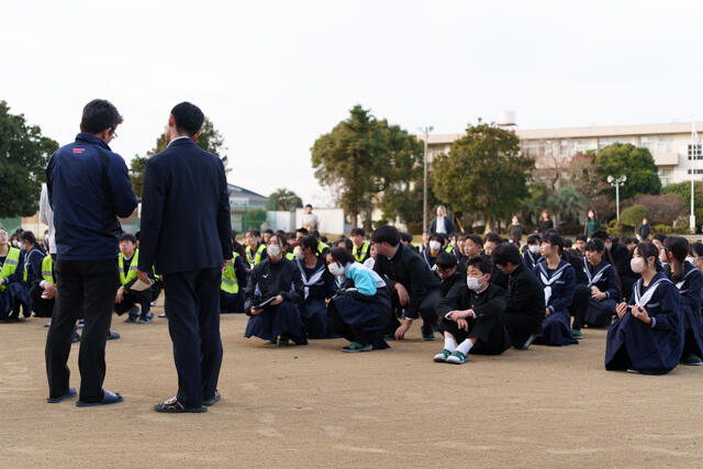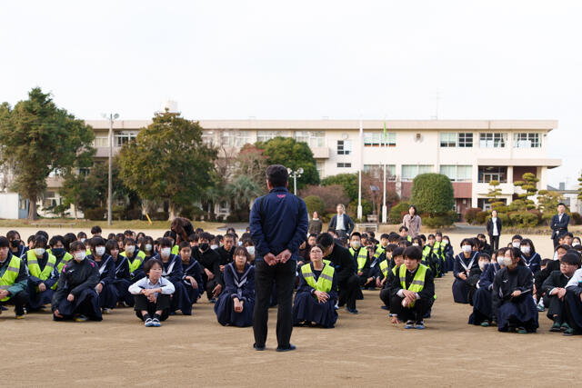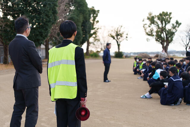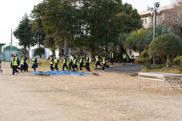 12月23日(火)15時25分、火災を想定した避難訓練を実施しました。 非常ベルと校内放送が流れると、生徒たちは落ち着いた様子で教室を後にしました。火元を避けた避難経路を通り、上履きのまま速やかに運動場へ集合しました。各クラス担任による点呼の後、校長先生へ全員の集合が報告されました。校長先生からは、「避難において最も重要なのは、全員の安全を把握することです。もし点呼の人数が合わなければ、先生方は校舎内を捜索することになります。いつ発生するかわからない災害時のためにも、日頃から遅刻や早退の報告をきちんとおこなって下さい」とのお話がありました。