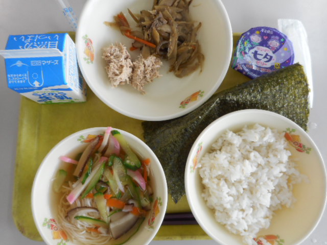 ツナマヨおにぎりをほおばりながら、冷た~いそうめん。
