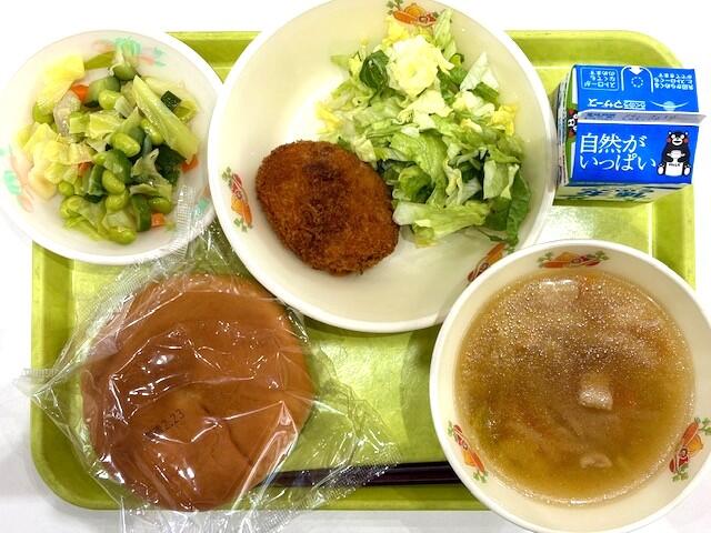 コロッケバーガー、牛乳、コンソメスープ、枝豆サラダ
