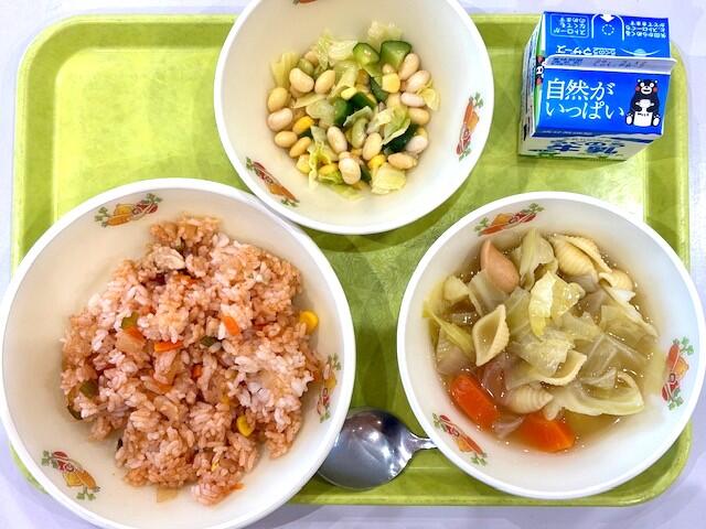 チキンライス、牛乳、キャベツのポトフ、ビーンズサラダ