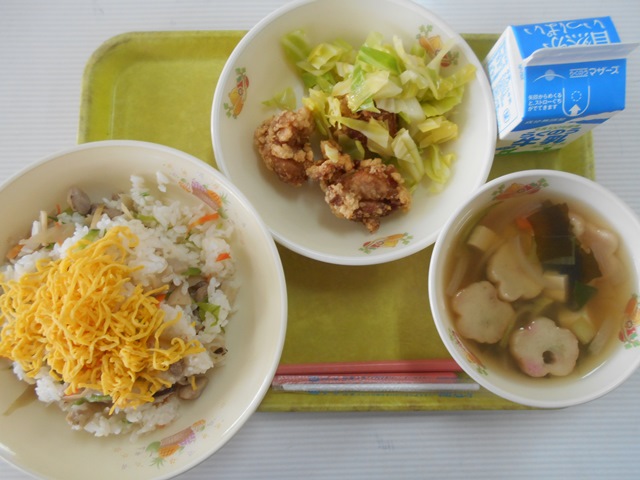 3月1日ランチメニュー 投稿日時 : 2018/03/01 Qshoku 【3月1日のメニュー】・五目ちらし寿司・鶏の唐揚げ・ボイルキャベツ・豆腐のすまし汁・牛乳 3年生のリクエスト給食第一弾!今日は唐揚げが大好評でした!