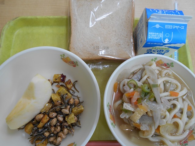 11月7日のランチメニュー 投稿日時 : 2017/11/07 Qshoku 【11月7日のメニュー】・黒糖パン・五目うどん・ミックスかりんとう・フルーツ・牛乳さつまいもが甘く、とても美味しかったです!