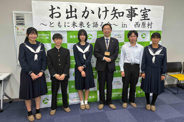今回、木村知事が西原村を訪問されることになり、西原中学校からも生徒5名が参加しました。生徒たちは、「学びの環境の充実」「交通移動手段」「半導体関連企業との連携」「住み続けられる村にするために」など、多岐にわたるテーマについて、意見や質問を知事に投げかけました。
