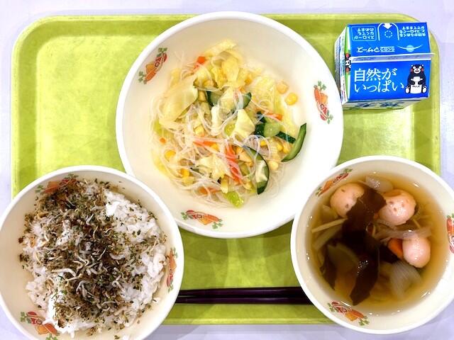 麦ごはん、牛乳、はんぺんのすまし汁、春雨の酢の物、手作りふりかけ