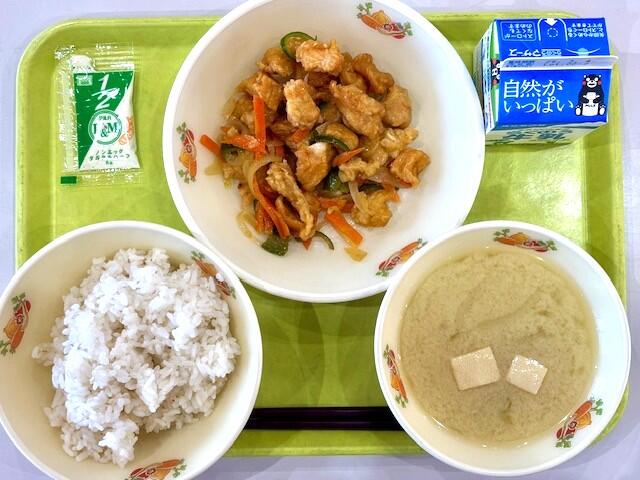 麦ごはん、牛乳、チキン南蛮、タルタルソース、高野豆腐の味噌汁
