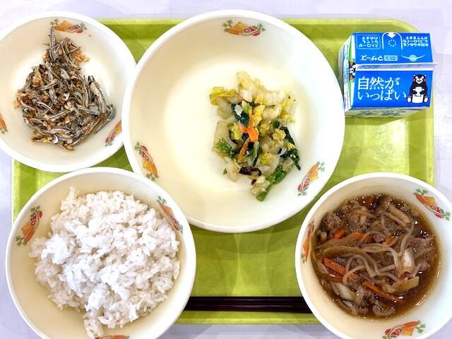 あかうし牛丼、牛乳、白菜のこんぶあえ、いりことナッツ