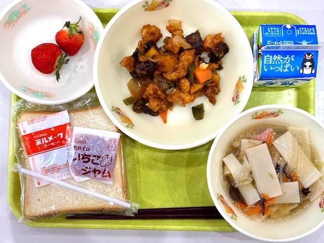 食パン、牛乳、レバーのケチャップあえ、ワンタンスープ、いちごジャム、ミルメーク