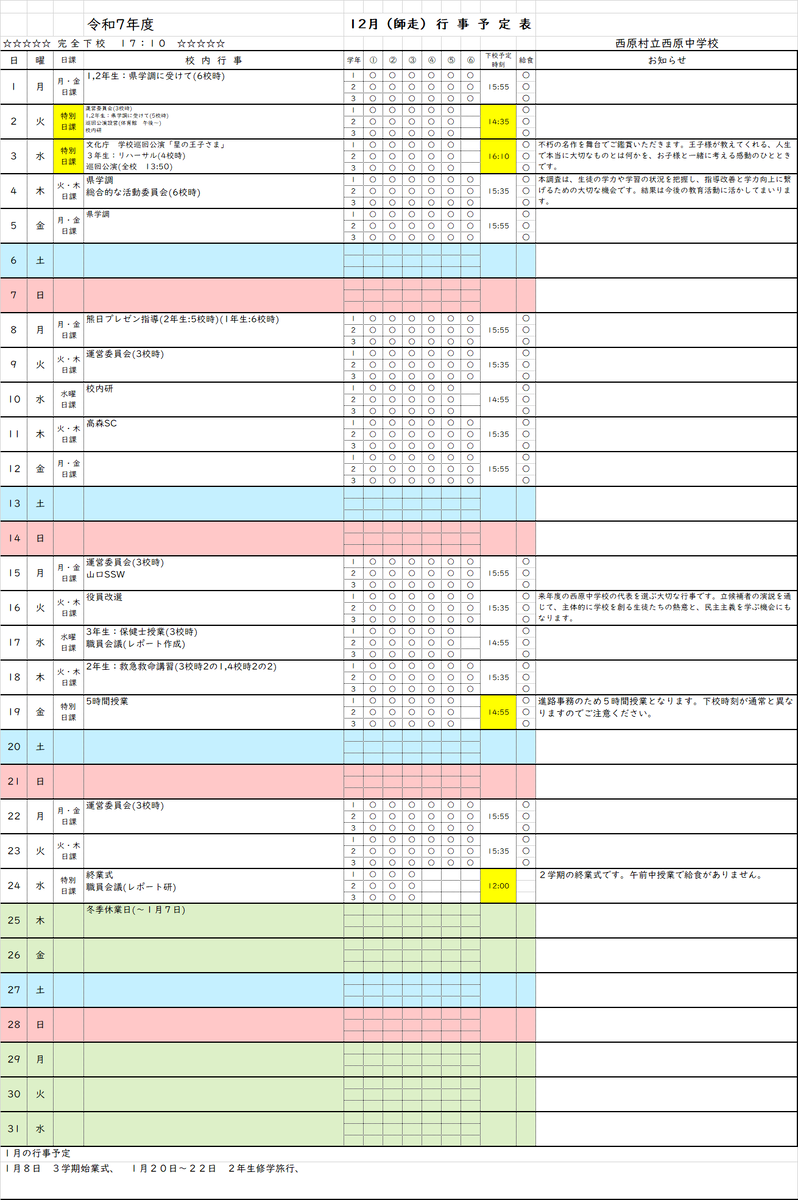 12月2日は5時間授業になります。お迎えなどお間違えが無いようにお願いします。