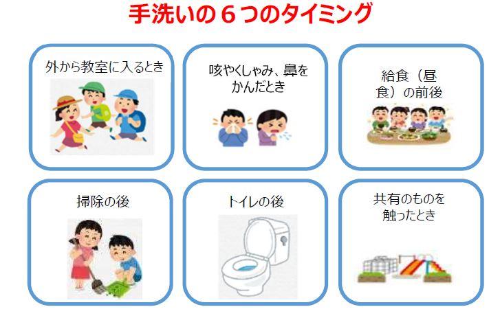 下の図のように、手洗い6つのタイミングとして紹介されていました。