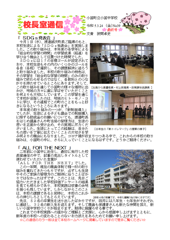 また、PTA総会では今年の中間報告、及び次年度役員の選出等、学年懇談会では、今年度の総括を行いますので併せてご参加ください。(校長 真嶋)