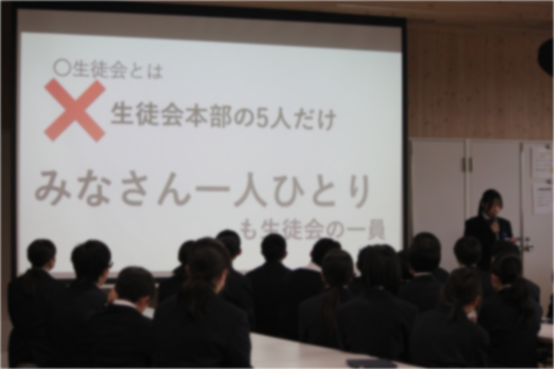 生徒集会では、生徒会長の江藤さんの説明がありました。生徒会は全員で作っていくものであることを熱く語ってくれました。江藤さんは生徒会長として、本年度は学校を楽しく豊かにしていきたいという思いを伝えてくれています。だからこそ、全員で創り上げたいという風に思ってくれていると思います。私たちもその熱い思いを受けて、生徒会を支えていきます。