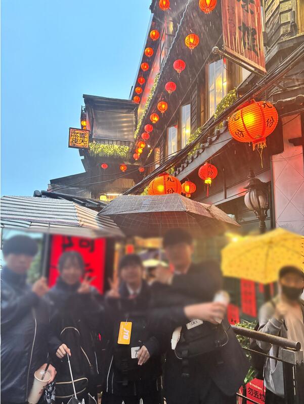 桃園国際空港に到着、入国手続き等を済ませ、バスで一路、九份へ。ここは「千と千尋の神隠し」のモデルになったところでもあります。あいにくの雨でしたが、小グループに分かれ(各グループに学校と町教委職員がつきました)、九份を散策しました。私が一緒だったグループでは、いちご飴やタピオカミルクティー、雑貨屋さんなどを楽しみました。現地の気さくな方との出会いもあり、写真を撮ってくれたり、台湾提灯や縁起物の紙馬などいろいろなプレゼントをもらったりもしました。台湾の食文化や雰囲気、人の温かさに触れました。散策後は、九份のレストランで食事をとったあと、宿泊先の豪景大酒店に到着し、1日目の行程を終えました。雨に濡れて寒かったですが、楽しい1日目となりました。(校長 真嶋)