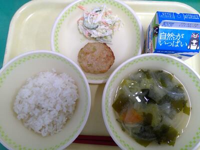 麦ごはん、きゃべつのみそ汁、つくね、大根とツナのマヨネーズ和え