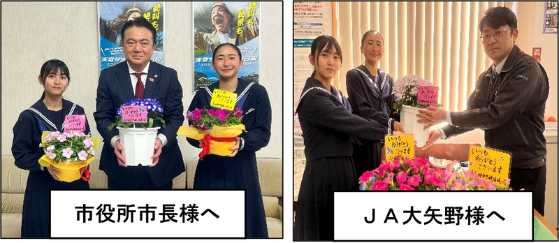 この日は、生徒会長の木下友花さんと副会長の山口優月さんが市役所とJA様に届けました。卒業式にもご出席いただいた市長の堀江隆臣様は満面の笑みで受け取ってくださいました。早速、市役所のインスタグラムにも紹介されているようです。